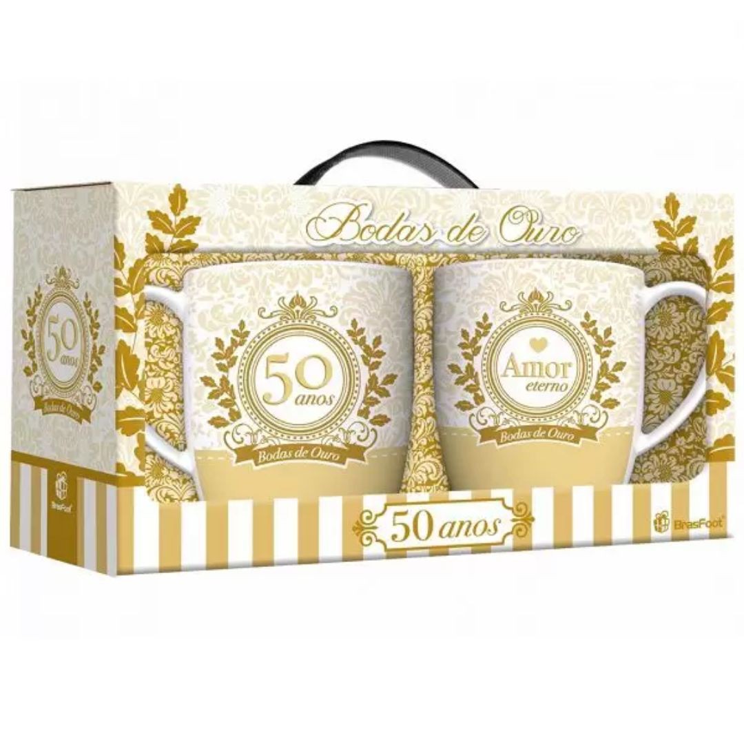 O Conjunto de Canecas Urban Bodas de Ouro é perfeita para presentear aquele super casal que está unido com muito amor há 50 anos. Eles vão poder apreciar aquele café quentinho nos momentos mais aconchegantes da vida de um jeito super especial. São fabricadas em porcelana de alta qualidade que garante maior durabilidade durante seu uso. Elas são um item essencial em qualquer café-da-manhã ou lanchinho no meio da tarde. Além disso dá pra usá-la como porta treco, porta lápis e até mesmo como um vasinho de plantas.