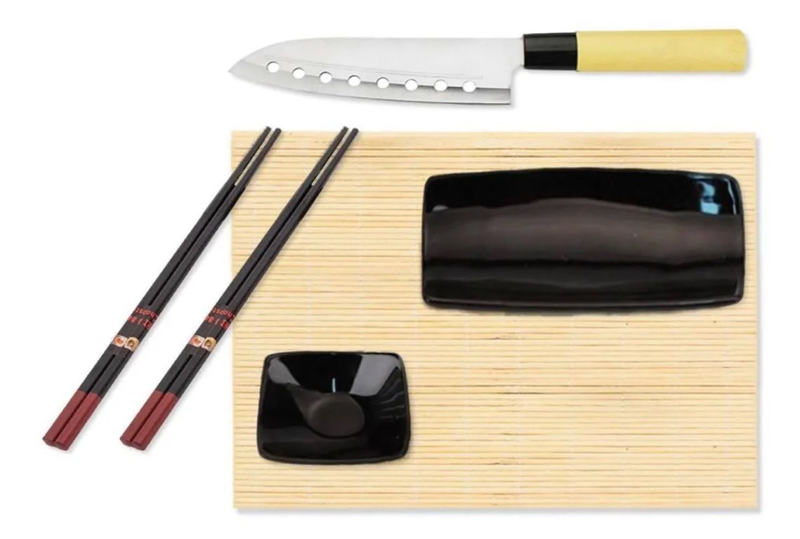 Composto de 1 faca santoku em inox com cabo de bambu, 1 esteira em bambu, 2 jogos de hachis, 1 pratinho para shoyo e 1 pratinho para servir.