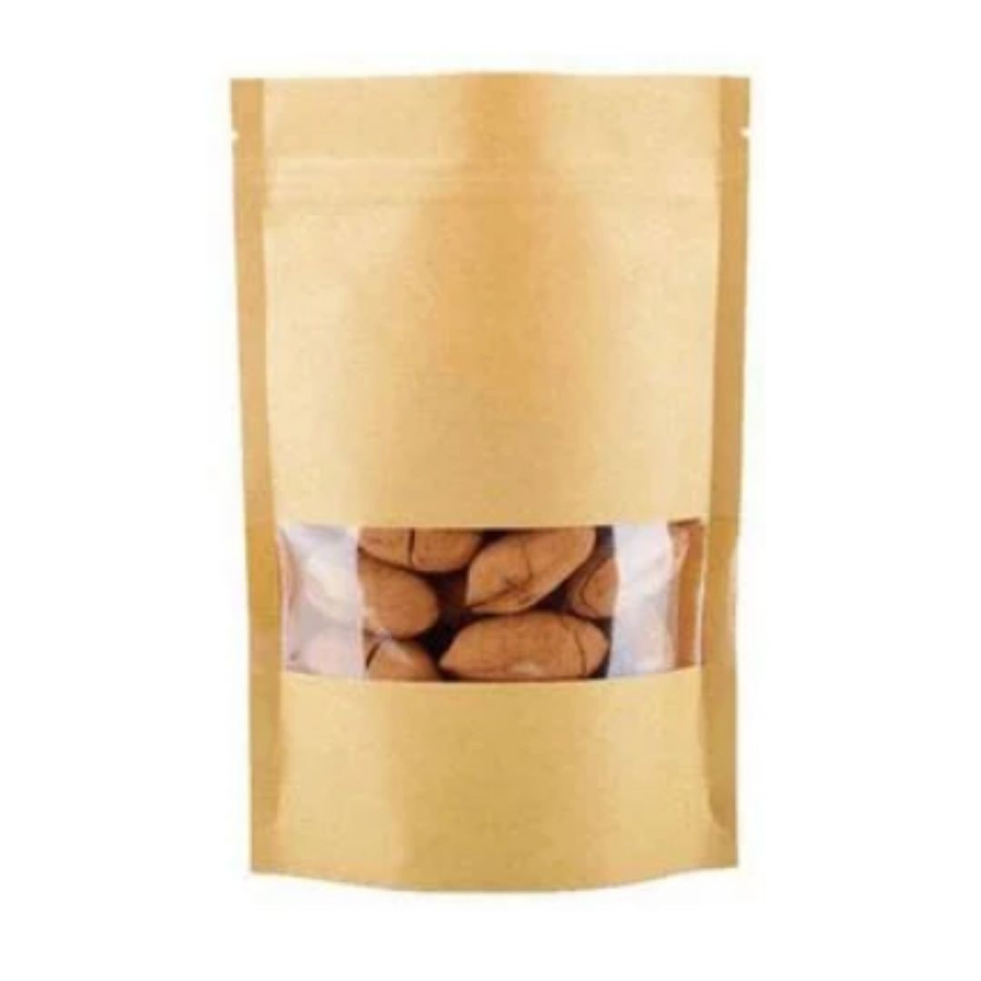 Saco Stand up Pouch de Papel Kraft Fosco laminado com visor de plástico e fecho Hermético