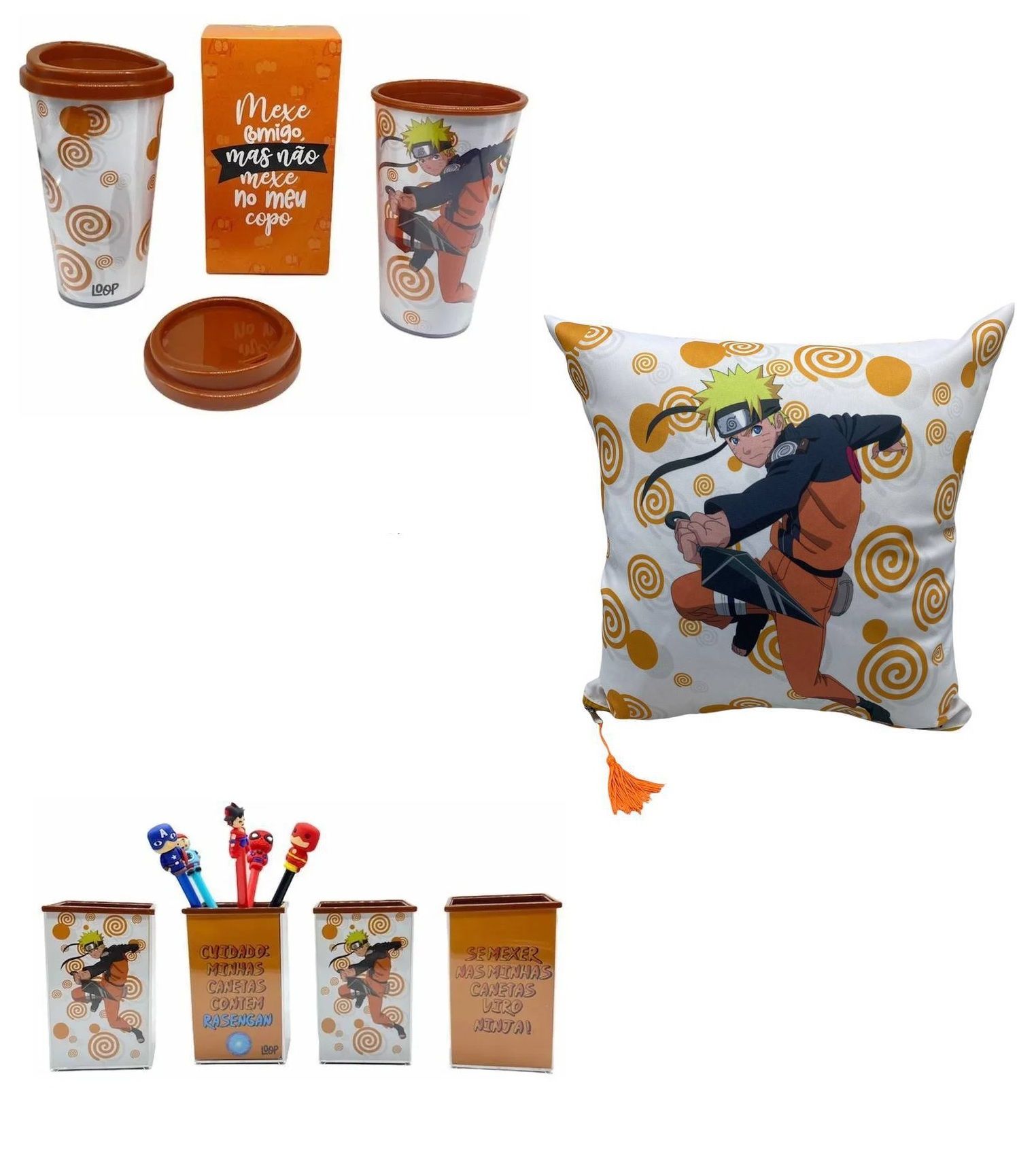 Kit com 3 produtos do Naruto: Copo Térmico + Almofada + Porta Treco