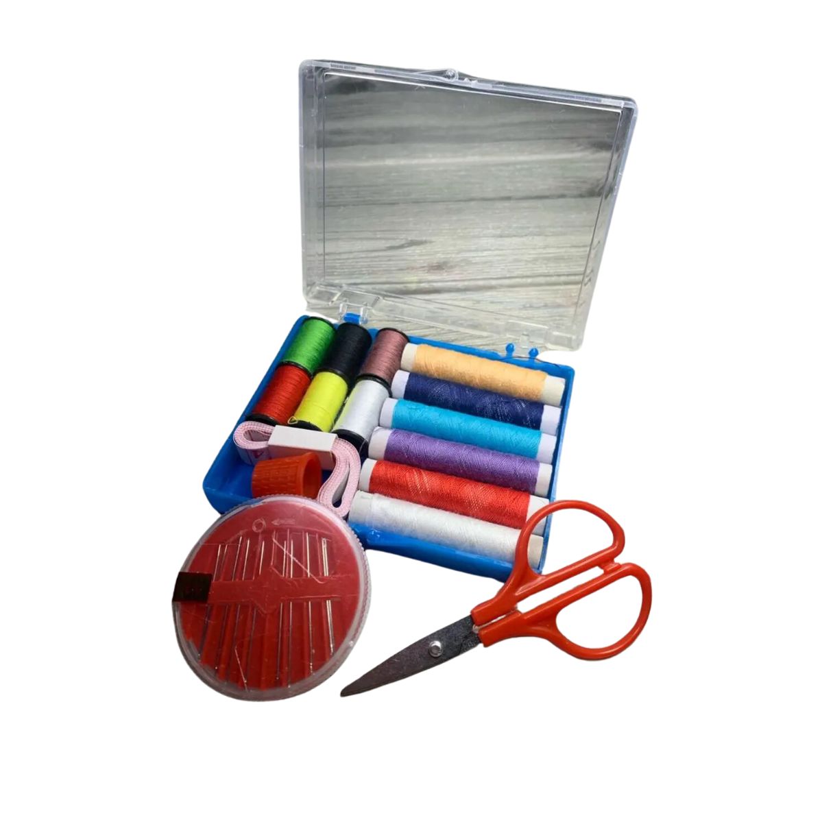 - O Kit Contém:1 tesoura 10 agulhas1 estojo1 dedeira 1 fita métrica 12 linhas de costura