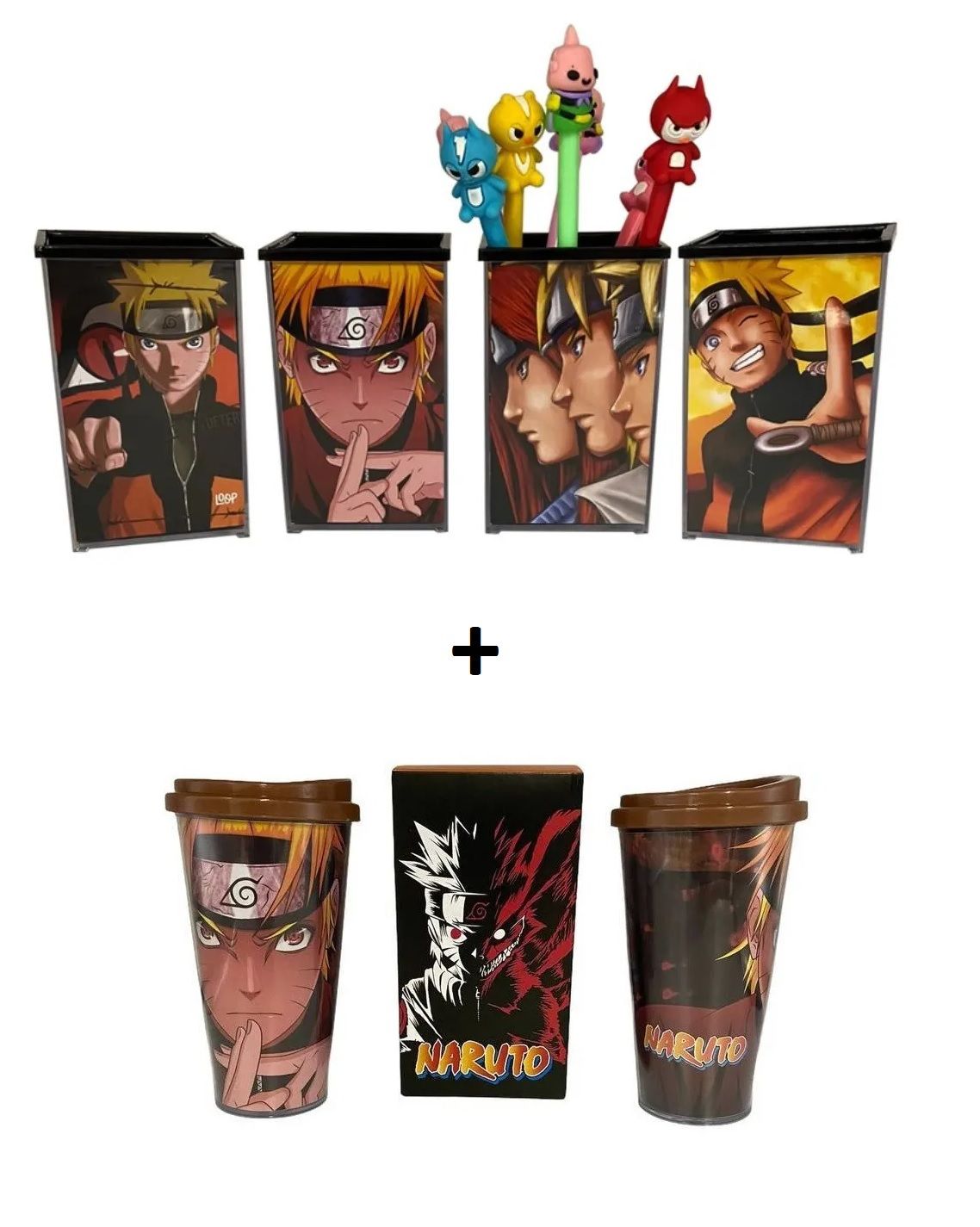 Se está querendo inovar seu ambiente e é fan de Naruto, chegou o que faltava na sua escrivaninha e no seu dia a dia! Um Porta Objetos / Porta Treco que pode ser usado para guardar as canetas, lápis, papéis e tudo mais que você queira e um Copo Térmico para te acompanhar por todo lado!