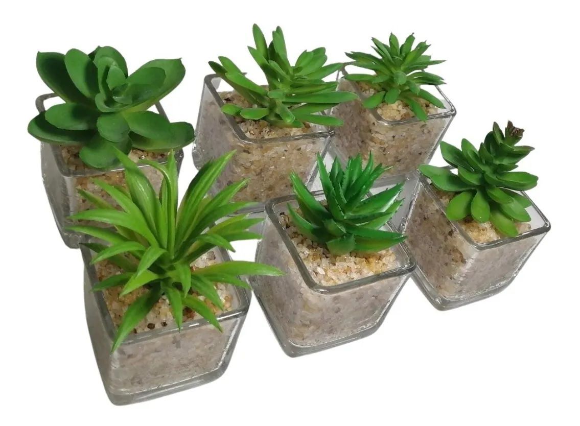 - Quantidade: 1 unidade de planta artificial mais 1 vasinho de vidro já montado (conforme fotos).